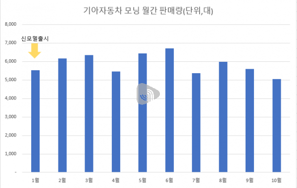 모닝은 1월에 구형과 신형을 합해 5523대를 기록했지만 2월부터는 구형의 판매를 중단하면서 월간 6000대에 이르는 판매량을 꾸준히 기록하고 있다.