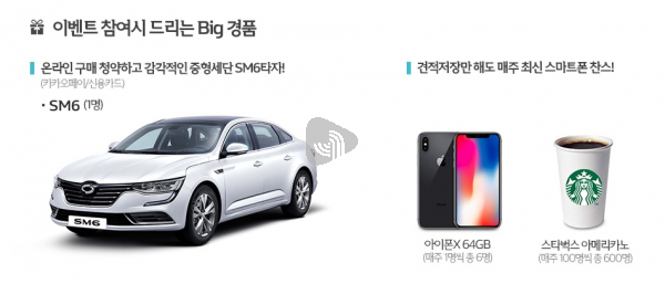르노삼성차 홈페이지의 e-커머스 페이지인 ‘e-쇼룸’을 통해 ‘내 차 만들기’ 완료 후 견적을 저장한 이벤트 참여 고객 중 추첨을 통해 최신 스마트폰 아이폰X 64GB를 매주 1명, 총 6명에게 제공한다. 스타벅스 아메리카노 기프티콘은 매주 100명, 총 600명에게 6주에 걸쳐 증정한다.