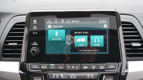 이 뿐만 아니라 1열 탑승객의 목소리를 마이크를 통해 2,3열의 스피커 및 헤드폰으로 들려주는 캐빈토크 기능도 함께 사용할 수 있다. 운전 중에 헤드폰을 이용 중인 탑승객 및 2,3열의 탑승객과도 원활한 소통이 가능하다. 안드로이드 디스플레이 오디오 상의 메뉴를 선택해 작동하며 오디오 볼륨 컨트롤을 통해 볼륨 조절도 가능하다. 다만 3열의 목소리는 1열로 전달할 수 없고, 전달되는 소리에 울림이 있어 장시간 듣기엔 좋지 않다.