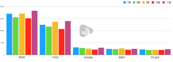 현대자동차, 기아자동차, 한국지엠, 르노삼성자동차, 쌍용자동차 등 5개사가 발표한 11월 내수 판매는 총 140,342대다. 지난 10월(11만 2729대)보다 24.4% 가량 늘어난 수치지만, 지난해 같은 기간과 비교하면 3.0% 감소했다.