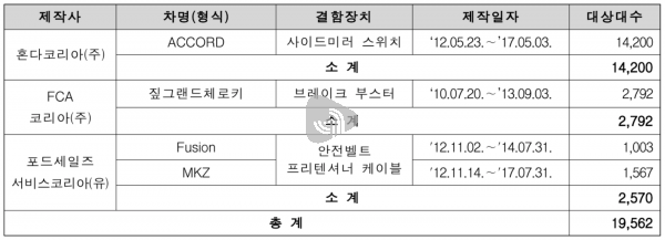 혼다코리아, FCA코리아 등에서 수입・판매한 4개 차종 19,562대에서 제작결함이 발견돼 리콜한다.