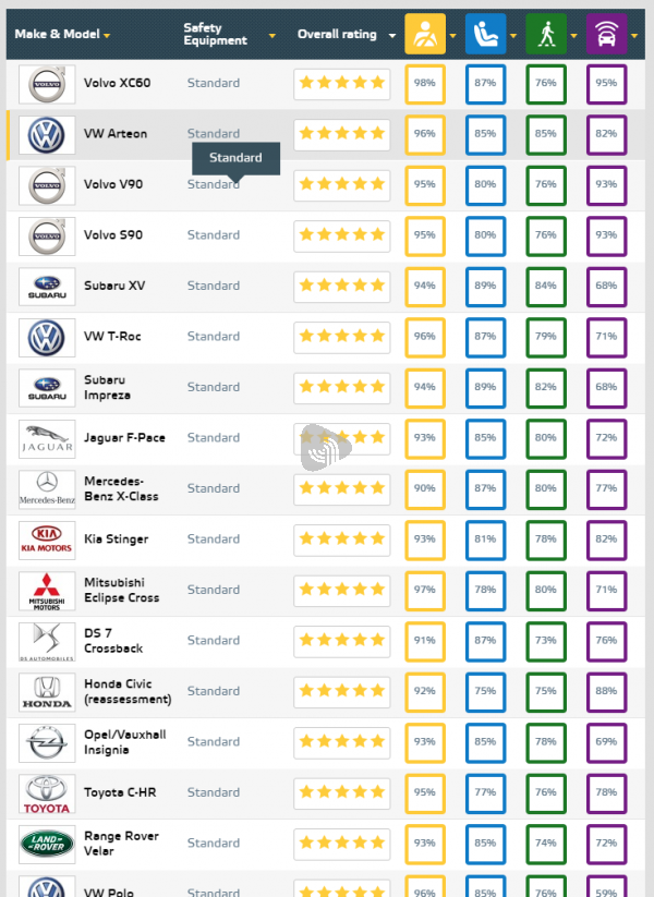 종합 순위에서도 볼보의 XC60, 폭스바겐 아테온, 볼보 V90, S90, 스바루 XV, 폭스바겐 티록, 스바루 임프레자, 재규어 F-PACE, 벤츠 X클래스에 이어 상위권에 이름을 올렸다.