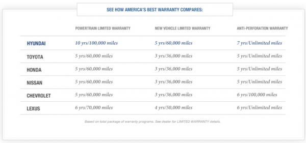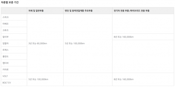 한편 미국에서 쉐보레의 보증기간은 차체 및 일반 부품 3년/3만6000마일(약 5만7000km), 파워트레인 5년/6만마일(약 9만6000km)로 국내와 동일하다. 현대차는 일반 5년/6만마일(약 9만6000km), 파워트레인 10년/10만마일(약 16만km), 차체 부식에 대한 보증 7년/무제한이다.