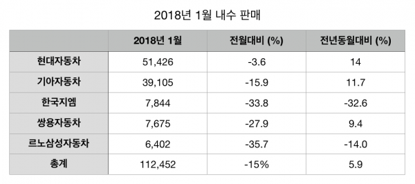 올해 국산차들의 첫 내수 판매 성적표는 제조사별로 희비가 엇갈렸다. 현대자동차, 기아자동차, 한국지엠 등 국산차 5개사가 발표한 1월 내수 판매는 총 11만 2,452대로 전년 동월 대비 5.9% 올랐다. 이는 지난해 같은 기간과 비교해 두자릿대 성장률을 기록한 현대・기아차의 영향이 컸다. 한국지엠과 르노삼성자동차는 각각 32.6%, 14.0% 등 큰 폭으로 감소했으며, 쌍용차는 지난달 최대 실적을 기록하며 9.4% 증가했다.