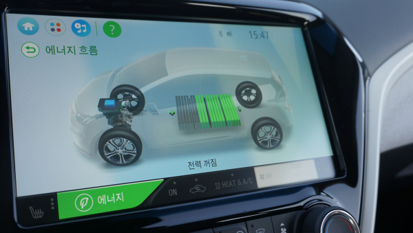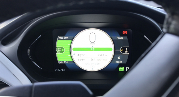 시승차를 받았을 때 주행 가능 거리는 262km였다. 먼저 서울역에서 출발해 일산 백석동까지 강변북로와 도심을 오가는 약 28km 거리를 주행했다. 출발하면서 히터와 열선 시트, 열선 스티어링 휠을 모두 켰다. 중간 중간 히터 바람 세기도 강하게 조절했다. 중간에 충분히 덥힌 열선 스티어링 휠은 껐다. 도착해서 계기판에 나타난 남은 주행 거리는 225km. 단순 계산으로 약 9km 를 갈 수 있는 전력을 더 소모한 셈이다. 히터 등으로 인한 전력 소모는 생각보다 적었다.