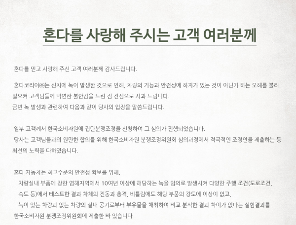 혼다코리아는 지난해 8월7일 고객센터를 통해 ‘녹’관련 이슈를 처음 접수했고 이후 자체 조사 후 9월 27일 녹제거와 방청작업을 포함한 대표이사 명의의 공식 입장문을 발표했다.