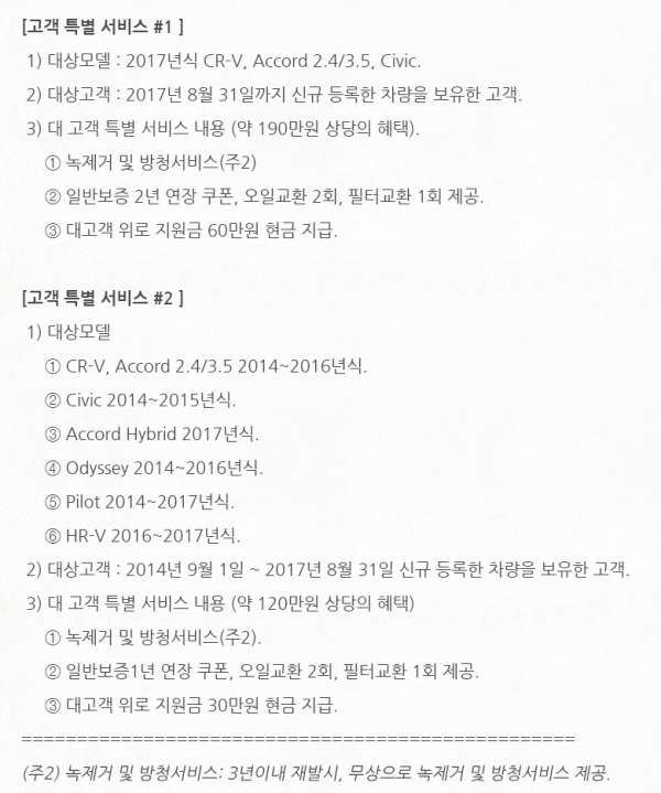 또, 2014년식부터 2017년식에 이르는 혼다의 CR-V, 어코드, 어코드 하이브리드, 시빅, 오딧세이, 파일럿, HR-V에 대해서는 총 120만원 상당의 혜택을 제공한다. 녹이 발생한 경우는 앞서 어코드나 시빅과 동일한 조건의 서비스를 제공하고 1년의 일반보증 연장, 오일교환 2회, 필터교환 1회와 함께 30만원의 현금 위로금을 지급한다.