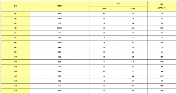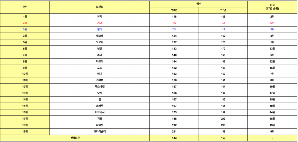 ‘2018 내구품질조사’는 2014년 9월부터 2015년 2월까지 미국에서 판매된 차량을 대상으로 구입 후 3년이 지난 차량의 고객들에게 177개 항목에 대한 내구품질 만족도를 조사해100대당 불만건수로 나타낸 결과이며, 점수가 낮을수록 높은 품질만족도를 의미한다.