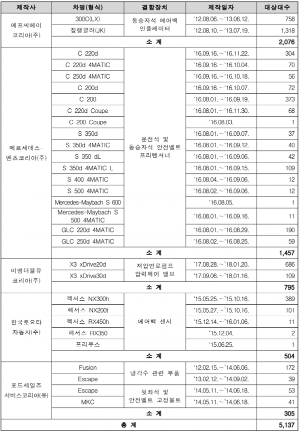 국토교통부는 FCA코리아, 메르세데스벤츠, BMW코리아 등 5개 업체에서 제작・수입해 판매한 자동차 29개 차종 5,137대를 리콜한다고 22일 밝혔다.
