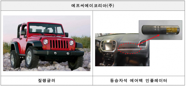 FCA코리아에서 수입・판매한 지프 랭글러 등 2개 차종 2,076대는 에어백 결함 가능성으로 리콜한다. 이들 차종은 다카타사의 에어백을 장착, 전개 시 인플레이터의 과도한 폭발압력으로 발생한 내부 부품의 금속 파편이 운전자 등에게 상해를 입힐 가능성이 있는 것으로 확인됐다.