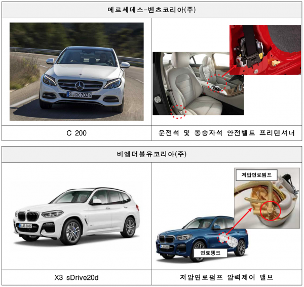 BMW X3 xDrive20d 등 2개 차종 795대는 연료탱크 내 부품(압력제어밸브) 결함으로 리콜한다. 해당 결함으로 연료탱크 내 연료가 남아 있더라도 정상적인 연료 공급이 되지 않아 주행 중 시동이 꺼질 가능성이 있는 것으로 나타났다.
