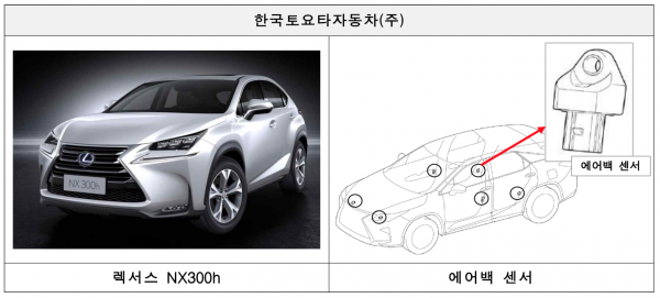 렉서스 NX300h 등 한국토요타자동차에서 수입・판매한 5개 차종 504대는 에어백센서 결함으로 에어백이 정상적으로 작동되지 않을 가능성이 있는 것으로 나타나 리콜한다.