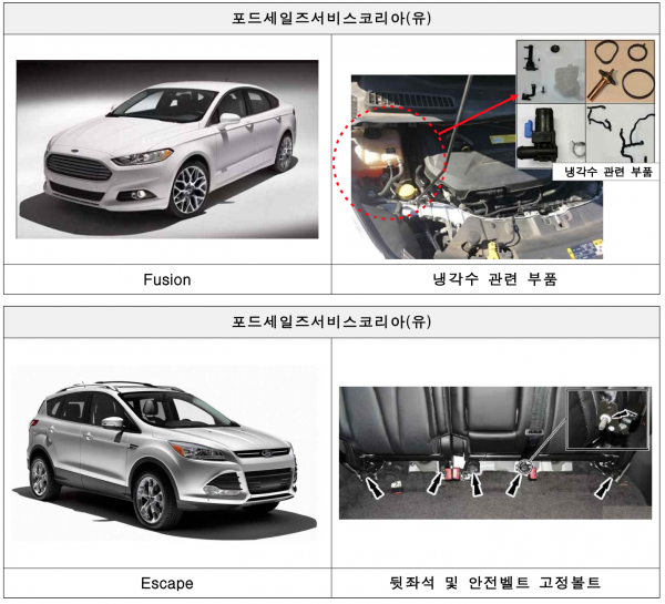 포드 퓨전 등 포드세일즈서비스코리아에서 수입・판매한 3개 차종 305대는 2가지 리콜을 실시한다. 포드 퓨전 등 2개 차종 211대는 냉각수 공급 시스템 내 부품 결함으로 리콜한다. 냉각시스템이 정상적으로 작동되지 않을 경우 실린더 헤더를 손상시키고 이로 인해 엔진 오일이 누유, 화재가 발생할 수 있다. 또 포드 이스케이프 등 2개 차종 94대는 뒷좌석 및 안전벨트 고정 볼트 결함으로 리콜한다.