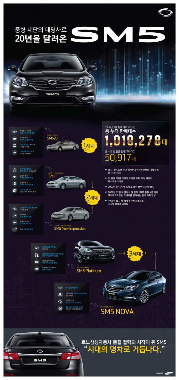 르노삼성자동차의 SM5는 1998년 처음 등장했다. 르노삼성자동차 브랜드와 함께 등장한 SM5는 2017년을 기준으로 누적 판매량 102만대를 기록했다. 출시 첫 해부터 내수 판매 4만대를 돌파했고 연 평균 5만대 이상 꾸준히 판매량을 기록했다.
