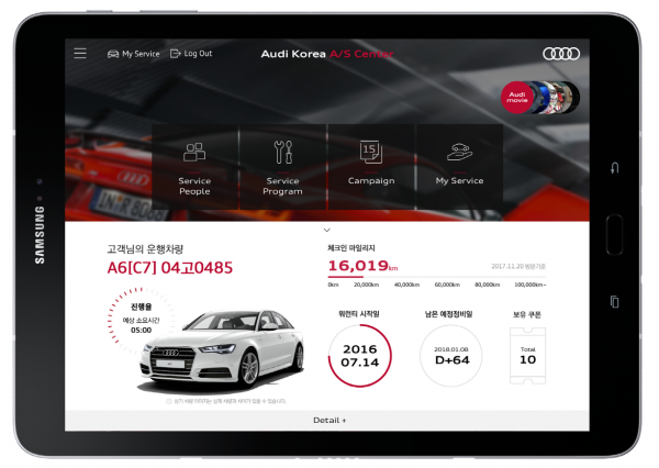 ‘아우디 A/S 디지털 라운지’는 아우디 디지털 프로젝트의 일환으로 전용 어플리케이션이 내장된 태블릿 PC를 통해 내방 고객과 서비스 어드바이저가 함께 해당 고객과 차량 정보를 통합적으로 확인하고 관리할 수 있다. 이 서비스를 통해 아우디 코리아는 서비스센터를 방문하는 고객을 위한 프리미엄 서비스를 제공해 고객 만족도를 높이고 서비스 어드바이저의 효율적인 고객 관리를 도와 고객과 아우디 서비스 어드바이저들의 업무 만족도 또한 함께 높인다는 계획이다.