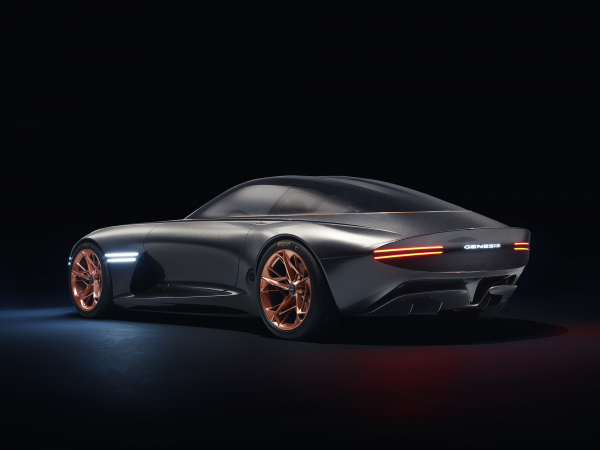 후면부는 공력 개선을 위해 트렁크 리드까지 툭 떨어지는 듯한 에어로 다이내믹 컷-오프 스타일로 디자인했다. 리어 램프는 헤드 램프와 마찬가지로 직선형 쿼드 램프를 적용했다. 아울러 제네시스의 마이다스 메탈 코퍼 색상의 휠을 적용해 고급감을 높였다.