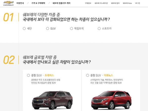 이 외에도 쉐보레는 온라인을 통해 쉐보레 차량에 대한 설문 조사를 진행 중이다. 쉐보레 차량 중 국내에서 만나보고 싶은 차량에 대한 내용이며 쉐보레 글로벌 차량 총 7개의 차종 중 선택할 수 있다. 선택지에는 올해 출시 예정인 중형 SUV 이쿼녹스와 함께 대형 SUV 타호, 픽업트럭 콜로라도, 스포츠카 콜벳 등이 포함돼 있다.