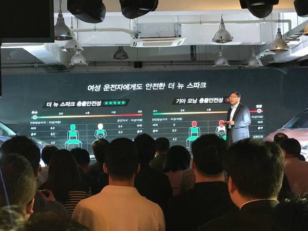 이날 쉐보레는 경쟁 차종인 기아차 모닝과 직접 비교를 통해 안전성을 강조했다. 한국지엠 안전성능개발담당 김동석 상무는 “여성 운전자 보호 기능이 향상된 에어백 최적화 등 다양한 노력을 통해 경차 중 유일하게 한국 신차 안전도 평가(KNCAP) 1등급을 획득했다”고 설명했다.