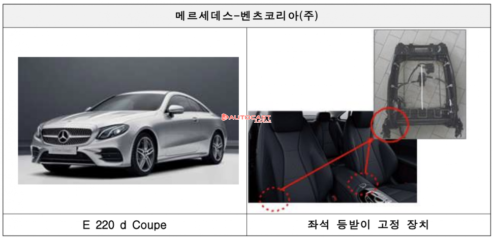 메르세데스-벤츠 E 220d Coupe 등 7개 차종 825대는 좌석 등받이의 고정 결함으로 리콜한다. 한국지엠에서 수입해 판매한 G2X 184대는 동승자석 승객 감지 센서의 결함으로 충돌 시 에어백이 전개되지 않아 리콜한다.