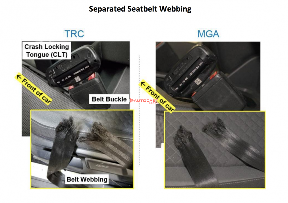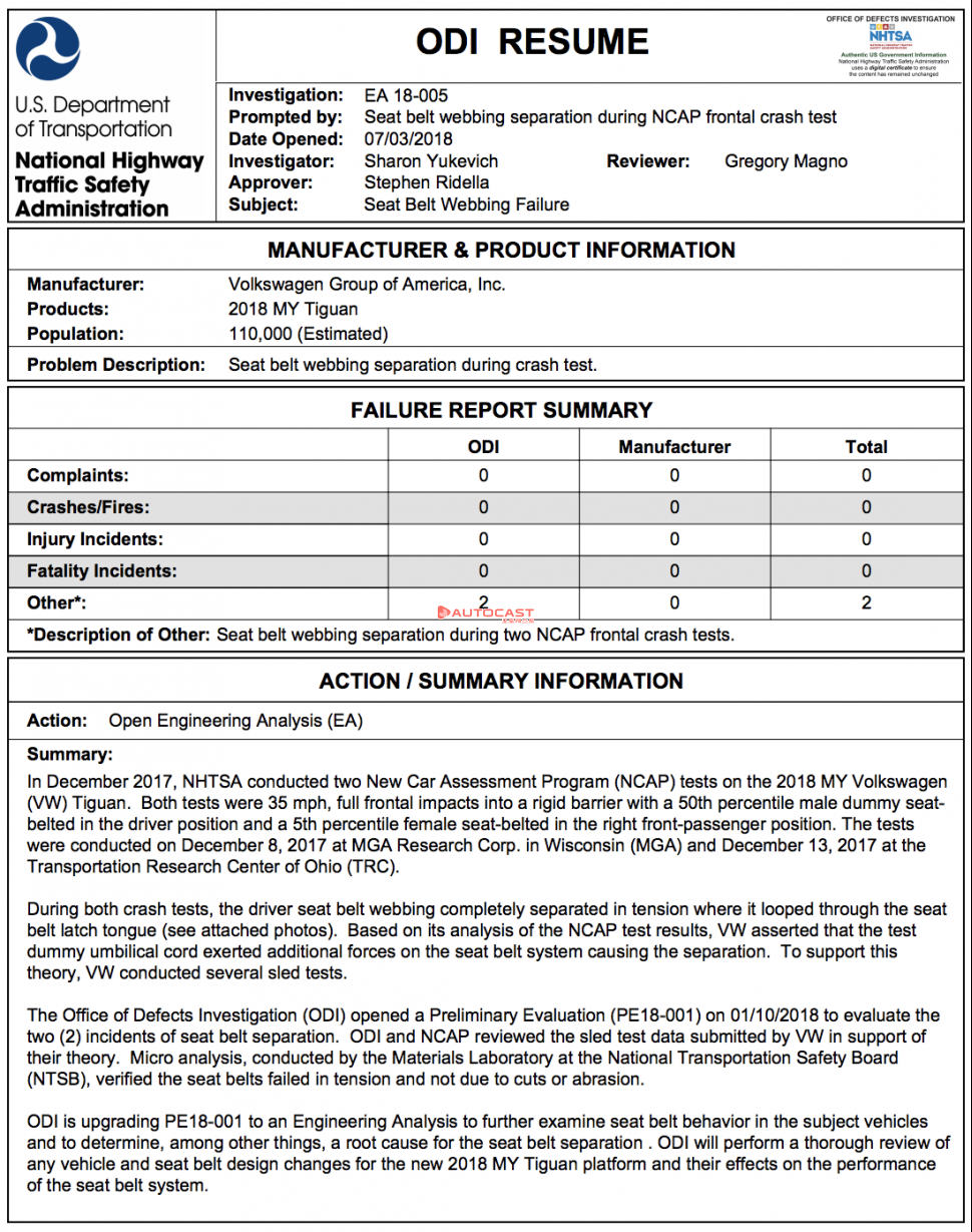 NHTSA가 웹사이트를 통해 공개한 보고서에 따르면 신형 티구안의 운전석과 동승자석에 각각 남성 더미와 여성 더미를 앉히고 35mph(약 56km)의 속도로 고정된 벽에 정면으로 충돌한 결과 운전석의 안전벨트가 완전히 끊어졌다. MGA 리서치와 TRC(Transportation Research Center of Ohio)에서 실시한 두 번의 충돌 시험에서 모두 같은 결과가 나왔다.