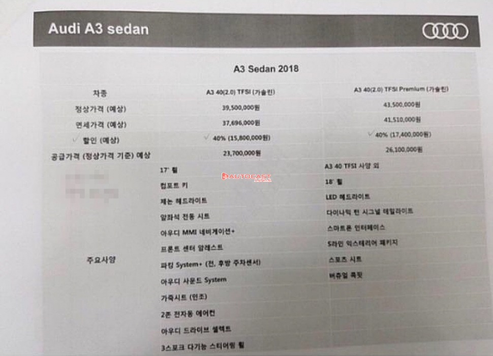 아우디코리아 관계자에 따르면 할인판매 수량은 약 3000대 수준이 될 것으로 예상된다. 정확한 가격은 아직 확정하지 않았다고 밝혔지만 일부 유출된 문서에 따르면 40% 수준의 할인이 유력하다. 또, 아우디의 파이낸셜 서비스를 이용한다는 조건이 붙을 것으로도 예상된다.