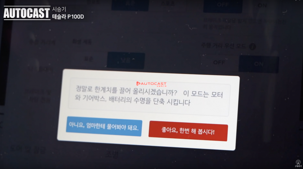 테슬라가 기존의 차와 가장 큰 차이는 고성능 모터의 가속감이다. 좀 달린다는 내연기관차들과 그 느낌이 완전히 다르다. 제로백 2.7초를 경험할 수 있다는 루디크러스(Ludicrous) 모드에 두고 가속 페달을 꾹 밟는 순간 모델 S P100D는 한 치의 머뭇거림 없이 훅 튀어나간다. 잠시 머리에 피가 뒤로 쏠리는 느낌이 들면서 현기증을 느낀다. 엔진음이나 배기음, 변속감이 전혀 없는 채로 미끄러지듯 가속하니 자동차에 탄 것 맞나 하는 의심까지 든다.