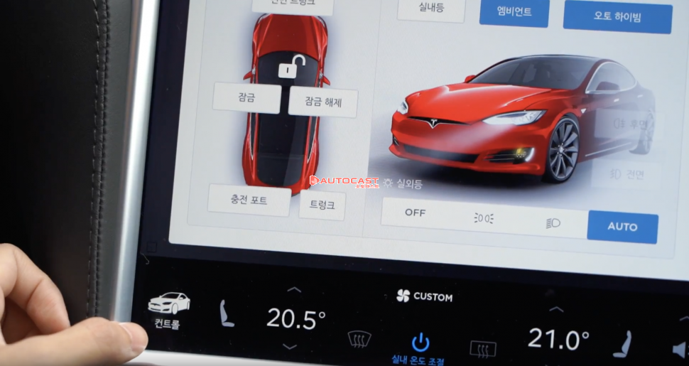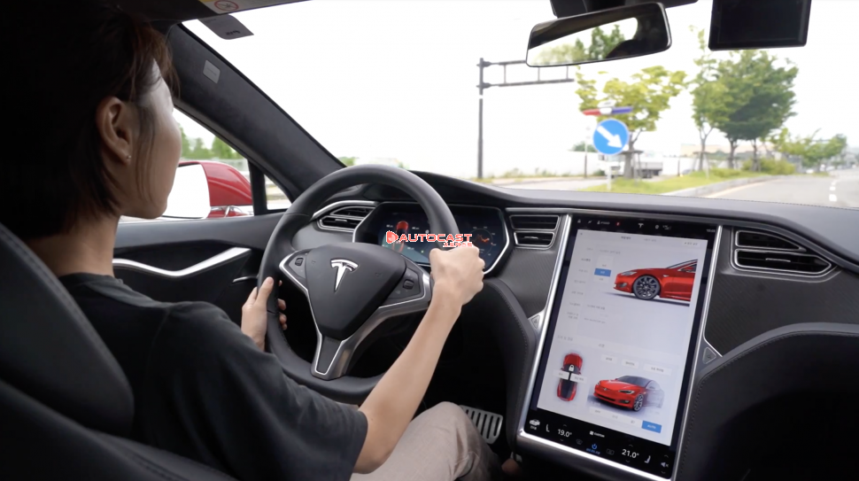 왼쪽 레버 아래 쪽에는 짧은 레버가 하나 더 있다. 이 레버로 오토파일럿, 즉 테슬라의 반자율주행 기능을 사용할 수 있다. 테슬라의 반자율주행은 양산차들 중에서도 꽤 완성도 높은 모습을 보여준다. 차량 곳곳에 달린 센서와 카메라가 작동해 계기판에 앞, 뒤, 옆 차를 그래픽으로 보여준다. 오토파일럿을 켜고 주행하는 동안엔 모터로 운전대를 강력하고 확실하게 잡아준다.