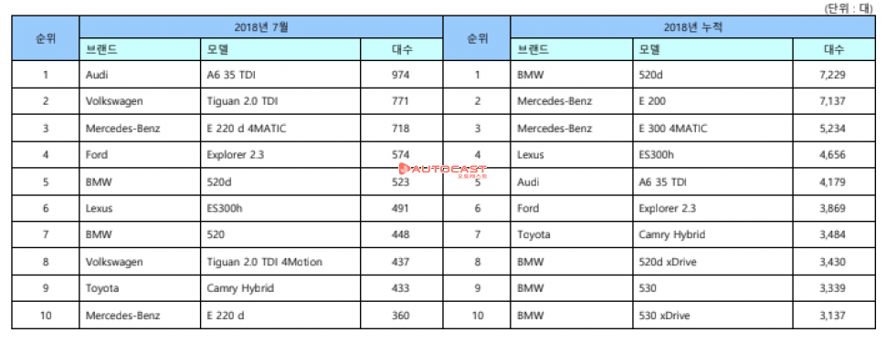 차종별로는 아우디의 A635TDI가 974대로 1위를 차지했다. 폭스바겐의 티구안 2.0 TDI가 771대로 2위 벤츠의 E220d 4MATIC이 718대로 3위 포드의 익스플로러 2.3이 574로 4위 BMW의 520d가 523대로 5위다.