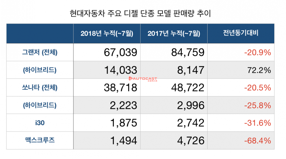 이외에도 i30는 전년 대비 31.6% 줄었고 맥스크루즈는 무려 68.4%나 판매량이 줄어들면서 디젤 트림 유지에 대한 부담이 커졌다.
