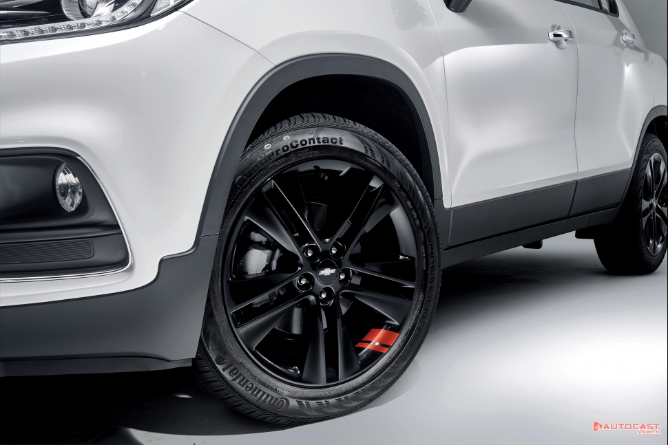 더 뉴 트랙스 레드라인 에디션은 차량 전면부에 블랙 그릴과 블랙 보타이 로고 앰블럼과 측면부의 윈도우 몰딩에 크롬을 대체한 블랙 컬러를 적용했다. 또 사이드 미러 커버를 블랙 컬러로 마무리했다. 레드라인 전용 18인치 블랙 알로이 휠에는 레드 컬러의 포인트 라인을 넣었다.
