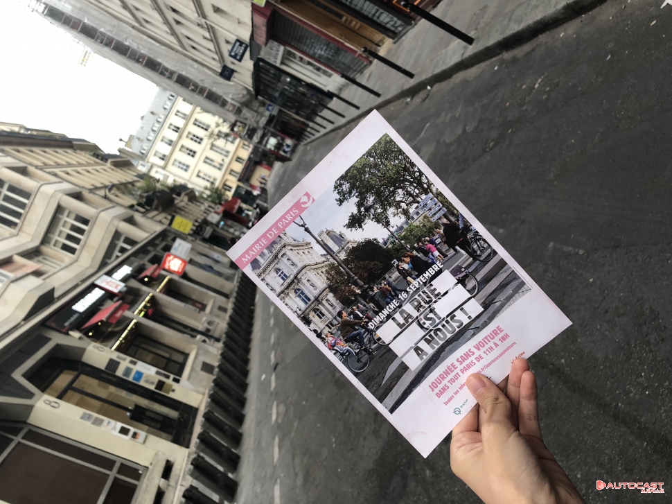 시청 직원이 건넨 전단지. 'LA RUE EST A NOUS(길은 우리의 것이다)' 라는 문구와 함께 '차 없는 날' 캠페인 취지가 적혀 있다.