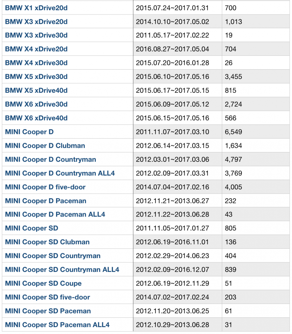 리콜 대상은 2011년 5월부터 2017년 5월까지 생산된 BMW 118d, 미니 쿠퍼d 등 디젤 차량 6만5,000여 대이며 모델별 생산 기간은 상이하다. 리콜 사유는 기존과 동일하다. EGR 쿨러의 누수로 인해 드문 경우 흡기다기관에 천공이 발생할 수 있고 나아가 극히 드문 경우 화재로 이어질 가능성이 있다는 것.