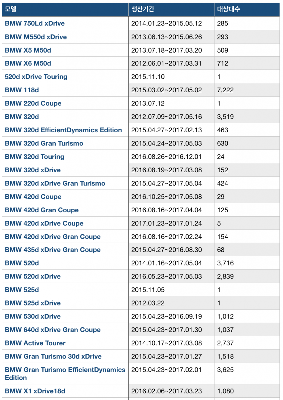 BMW 그룹 코리아가 디젤 차량 EGR 모듈 관련 리콜 대상 차종을 추가한다고 23일 밝혔다. 이번 추가 조치로 현재 리콜을 진행 중인 10만6,000여대에 더해져 리콜 규모는 총 17만1000여대로 늘었다