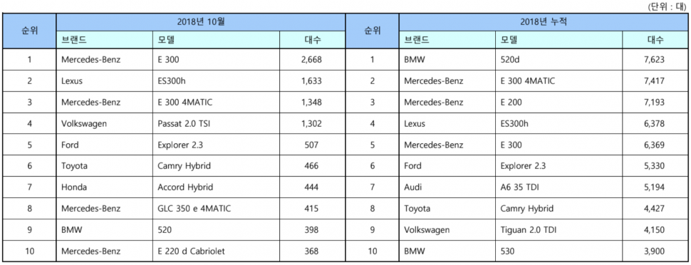 모델별로는 메르세데스-벤츠 E300(2668대), 렉서스 ES300h(1633대), 메르세데스-벤츠 E300 4MATIC(1348대) 순으로 가장 많이 판매됐다. 연료별로는 가솔린 1만2,197대(58.6%), 디젤 4,740대(22.8%), 하이브리드 3,865대(18.6%), 전기 11대(0.1%) 순으로 나타났다.