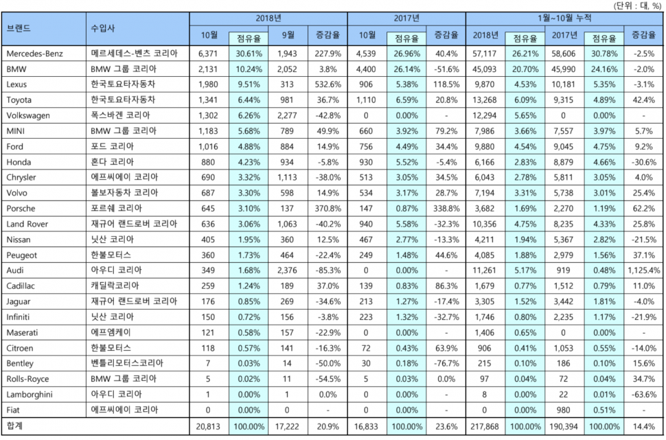 지난 8, 9월 물량 부족 및 화재 결함 등의 문제로 벤츠와 BMW가 주춤한 사이 아우디・폭스바겐이 빠르게 점유율을 늘려가는 듯 했으나 벤츠가 월 6,000대 이상을 판매하며 다시 1위로 올라섰다. 지난 달 수입차 판매 1, 2위였던 아우디・폭스바겐은 각각 15위, 5위로 밀려났다. 아우디는 지난 9월 A3 할인 판매가 끝나자 349대로 85% 줄었다. 화재 위험으로 리콜 진행 중인 BMW는 2131대를 판매하며 2위에 올랐다.