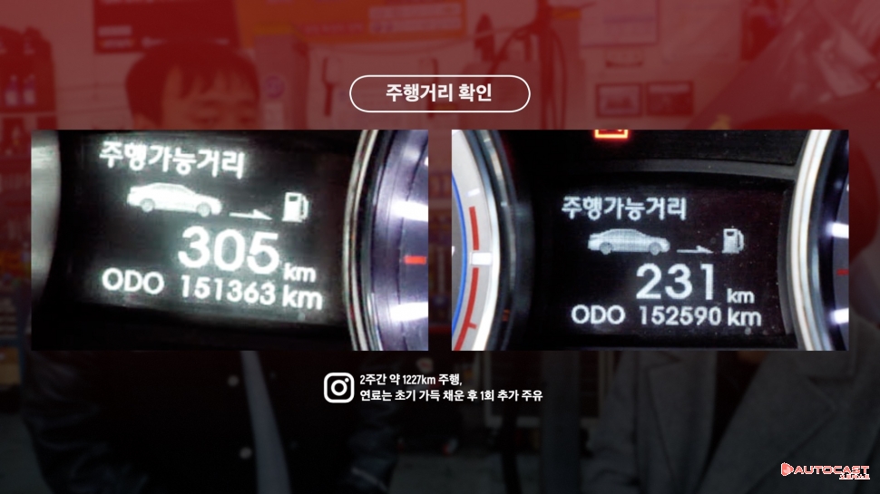 누적 주행거리는 15만2590km. 약 1227km를 주행했다. 처음에 있던 연료를 1/3 정도 사용했을 때 다시 가득 주유했다. 연료 세정제 제조사는 통상 3000km 정도 주행 까지 효과가 지속된다고 말한다. 이후에는 세정제가 연료에 희석되어 사라지므로 효과 역시 사라진다는 설명이다.