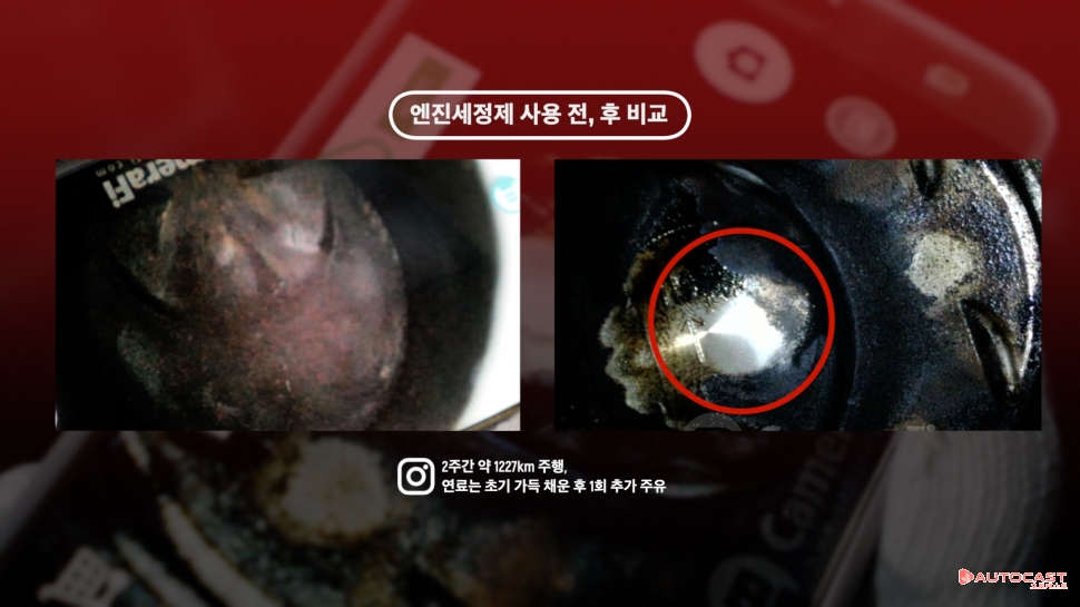 실험실의 데이터를 활용한 비교는 할 수 없는 한계가 있지만 육안으로라도 확인하기 위해 실험을 계속했다. 엔진 세정제를 투입했고 연료통을 두 번 정도 비울 동안 주행한 뒤 다시 만나기로 했다. 약 2주 뒤 주행거리를 채울 수 있었고 다시 엔진 실린더를 확인하기 위해 만났다.