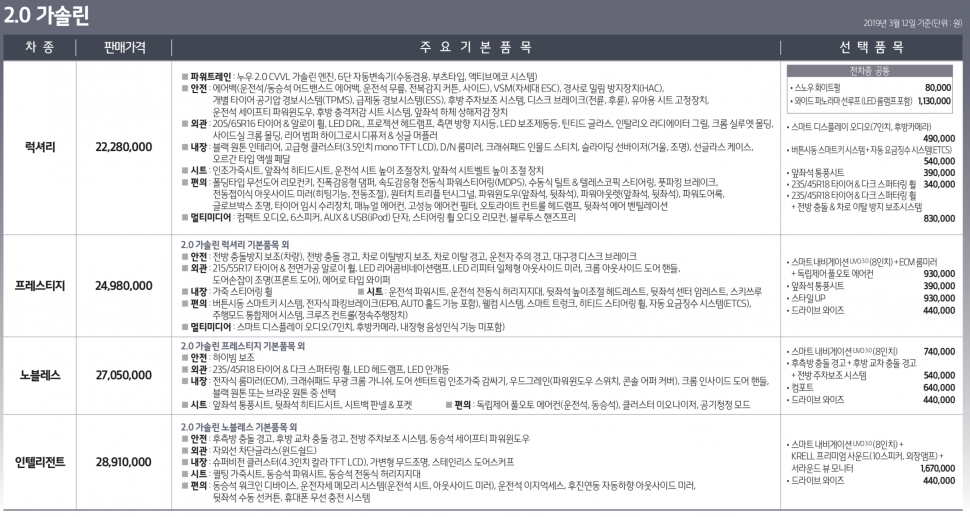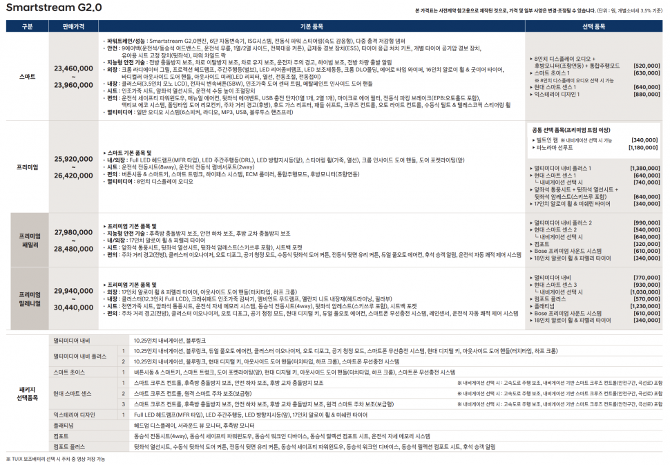 한편 지금까지 알려진 신형 쏘나타의 옵션표에 따르면 가장 기본 트림에서는 내비게이션 외에도 내장형 블랙박스, 뒷좌석 암레스트를 별도로 선택할 수 없으며 뒷좌석 암레스트를 선택하려면 앞좌석 통풍시트와 뒷좌석 열선시트까지 함께 묶어 64만원을 추가로 지불해야한다.