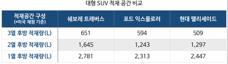 적재용량 역시 차체가 큰 트래버스가 가장 앞선다. 트래버스의 기본 트렁크 적재량은 651L다. 3열을 접으면 1,645L, 2열과 3열을 모두 접으면, 적재량은 최대 2,781L까지 늘어난다. 기본 적재량을 비교했을 때 트래버스가 594L의 익스플로러 보다 57L 더 크다. 팰리세이드와 비교하면 트래버스가 142L 더 넓다.