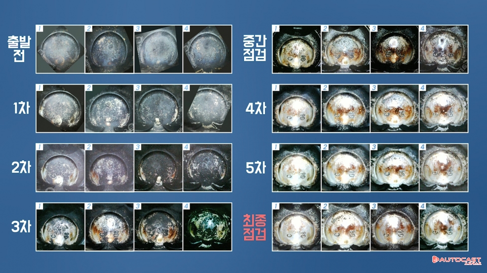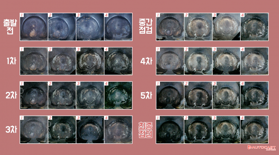 사전 내시경 점검 결과 두 차량 모두 엔진 내 피스톤 상부에 검게 쌓인 엔진 때를 확인했다. 약 120km를 주행한 1차 점검까지는 두 차량 모두 큰 변화가 없었다. 200km를 넘어선 2차 점검에서 불스원샷 주입차량의 피스톤 상부 타각이 보이기 시작했다. 약 330km를 주행한 3차 점검에서는 불스원샷 주입차량의 엔진 때가 상당 부분 제거된 것을 육안으로 확인할 수 있다.