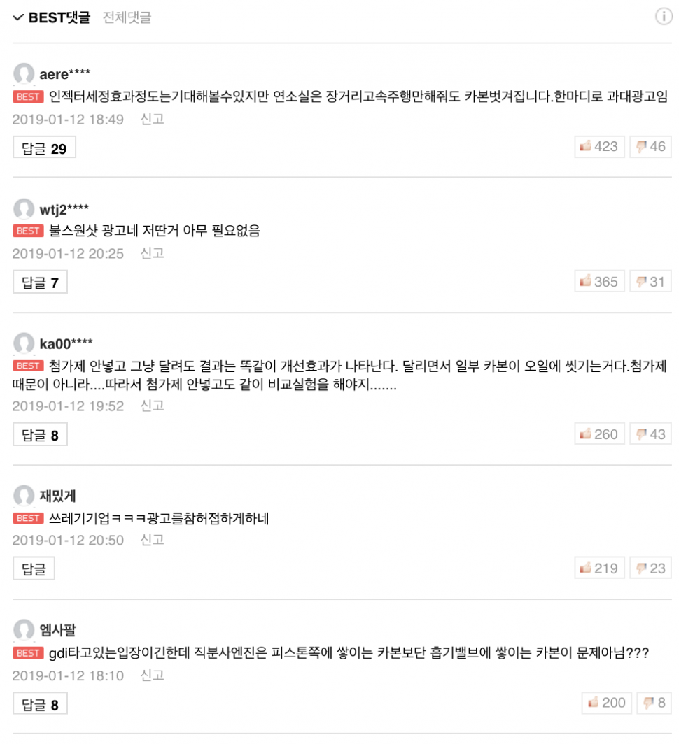 댓글을 통해 역시 그 효과에 대한 의문을 제기하는 사람이 많았다. ‘인젝터 세정 효과 정도는 기대해볼 수 있지만 연소실은 장거리 고속주행만 해줘도 카본이 벗겨진다’, ‘첨가제 안 넣고 달려도 결과는 똑같이 개선 효과는 나타난다’, ‘아반떼 40만키로 운행 중인데 세정제 불필요하다’, ‘넣어도 안 넣어도 차이 못 느낀다. 차라리 운전 습관을 바꾸는 게 낫다’, ’‘보약 개념이지 체감 효과보다는 심리적 안정감’ 등 회의적인 댓글이 많았다. 오토캐스트의 실험은 규모의 한계와 비교군의 부재 등의 아쉬움을 남기고 다음을 기약했다.