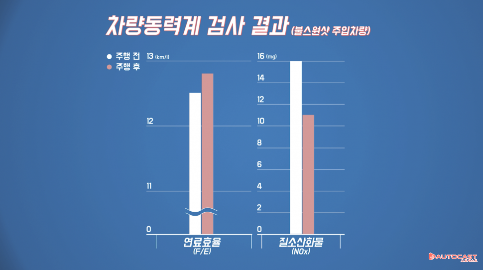 불스원 측은 “이번 테스트를 통해 실차 비교 테스트를 통해 불스원샷의 확실한 엔진세정 효과를 확인할 수 있었으며, 고속주행만으로는 엔진 때를 제거할 수 없다는 사실이 확인했다”고 설명했다.