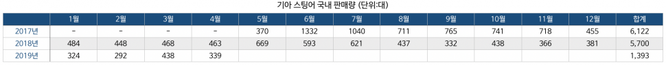 지난 2017년 5월 스팅어는 국내 출시를 앞두고 사전계약만 2700대를 기록하는 등 인기몰이를 했으나 기세를 이어가진 못했다. 국내에서는 월 평균 300대 수준으로 팔리며 지난해 총 5700대를 기록했다. 2019년형을 출시하면서 기존 모델을 최대 1000만원까지 할인해 판매하는 등 재고처리를 하는 모습도 보였다.
