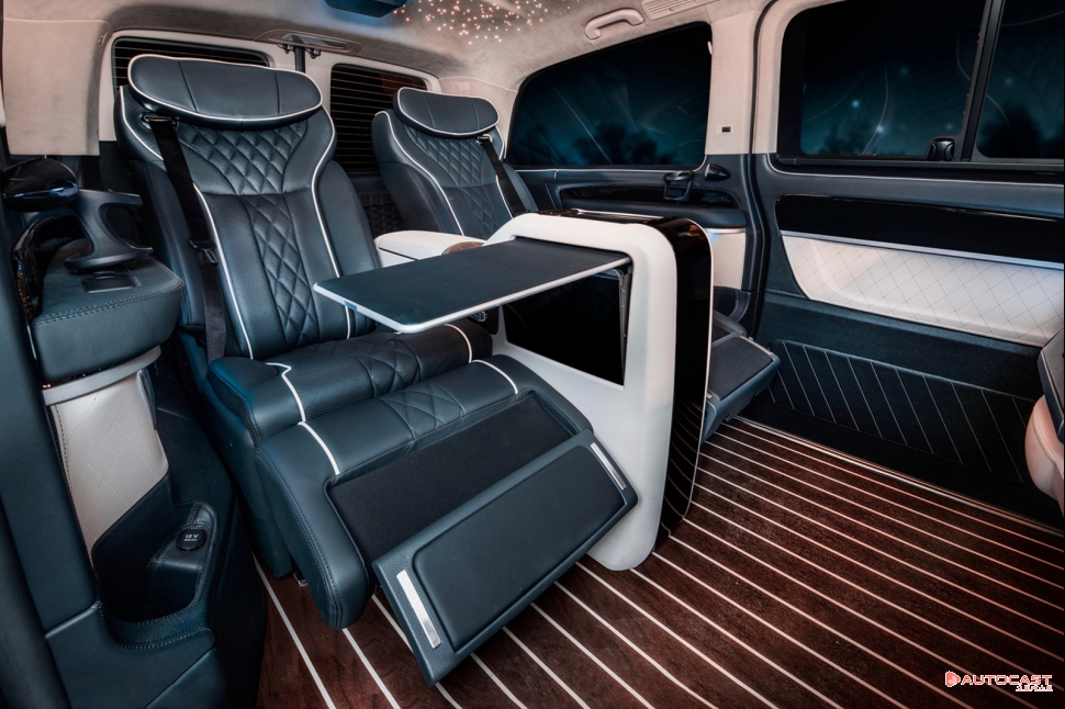 승객석의 양쪽 문은 모두 전자동 슬라이딩 도어다. 승객석 모두에는 통풍, 열선, 안마 시트는 물론 전 자동 레그 서포트와 테이블을 장착했다. 시트 양쪽에는 포칼 스피커를 장착하고 중앙 콘솔에서 조정 가능한 최고급 알파인 앰프를 탑재했다. 천장은 스타라이트 조명을 시공해 고급감을 더했다. RGB 컬러의 실내 무드등은 취향에 따라 다르게 연출 가능하다. 이 밖에도 아이퓨리 공기청정기와 미니 냉장고도 제공한다.