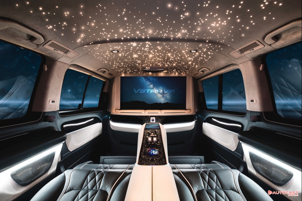 브이스타 VIP는 운전석과 승객석 사이에 전자동으로 열고 닫을 수 있는 프라이빗 파티션을 설치해 프라이버시를 보호하도록 했다. 또 이동 시 휴식과 업무처리를 위해 승객석 공간 구성을 재설계하고, 최첨단 멀티미디어 및 편의사양을 대거 탑재했다.