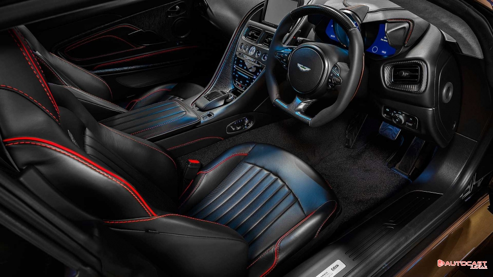 내부에는 1969년식 오리지널 애스턴 마틴 DBS처럼 검은색상의 가죽 트림에 회색의 알칸타라로 액센트를 줬다. 또한, 글로브 박스, 센터 콘솔, 그리고 시트 스티칭 등이 붉은 색상으로 꾸며졌다. 오디오는 뱅앤올룹슨 베오사운드 시스템이 서브우퍼와 함께 적용됐다.