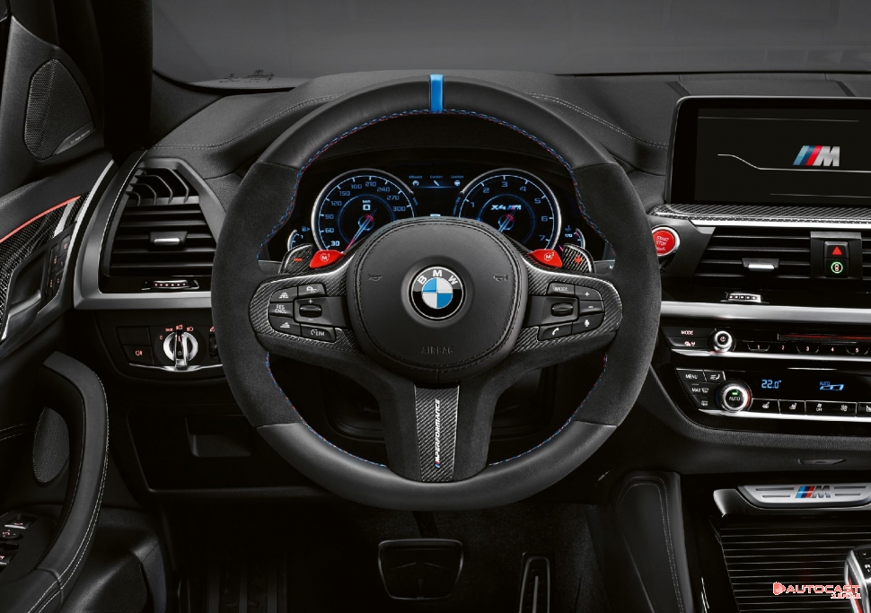 BMW 제품군에서 사용할 수 있는 다른 M 퍼포먼스 부품과 마찬가지로 X3 M 및 X4 M에 제공되는 부품에는 다양한 인테리어 트림도 포함되어 있다. 예를 들어, 하이그로시 카본으로 제공되는 M 퍼포먼스 스티어링 휠이 여기에 포함된다. 또한 M 퍼포먼스 카본 파이버 시프트 패들, 카본 기어 셀렉터 노브 및 M 퍼포먼스가 새겨진 고품질 벨벳 벨루어 플로어 매트도 주문할 수 있다.