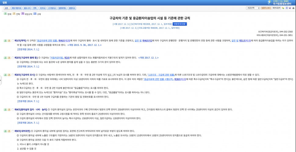 미국과 유럽 등은 구급차 성능과 안락성에 대한 규정까지 제시하고 있다. 이에 반해 우리나라에는 구급차에 대한 구체적인 제작 기준이나 운행 규정 등이 없는 실정이다. 다시 한 번 살펴보면 ‘승합차 또는 화물차로 지붕 덮개가 있는 것’, ‘간이침대, 보조 들것을 실을 수 있는 크기의 문을 갖춰야 하는 것’. 이 정도가 전부다.