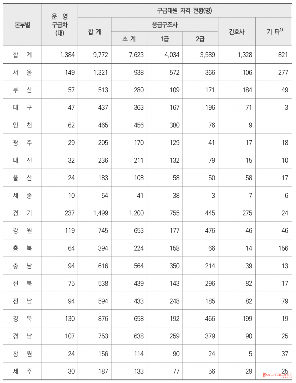 구급차에 대한 논의는 국회에서도 일부 있었다. 하지만 구급차의 기준이나 설비 요건을 이야기하기 전에 지방 소도시의 경우 구급차의 수량이 절대 부족하다. 2018 소방청 통계연보에 따르면 국내 운영 중인 119 구급차는 1,384대다. 서울, 경기 지역의 운영 구급차는 각각 149대, 237대이지만 창원, 울산 등은 24대 수준에 머물러 있다. 인구 단위당 구급차 배치를 살펴보면 10만 명, 20만 명 되는 지역에 구급차 한 대가 배정돼 있는 곳이 태반이다. 심지어 일부 농어촌에서는 구급차 관련한 장비와 인력이 부족해 소방 펌프차에 구급 장비를 적재해 긴급 응급 구조 시 활용하기도 한다. 해외에서는 이미 구급차의 설비, 설치요건, 활용방법 등에 대해 자세한 메뉴얼까지 마련했지만, 우리나라의 구급차 환경은 아직까지도 매우 열악한 상황이다.