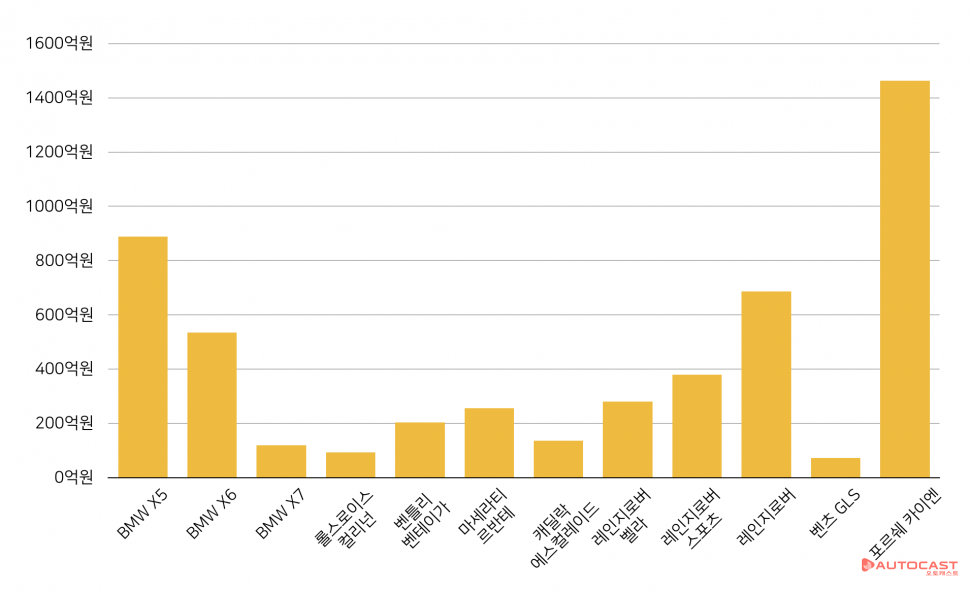 수입차협회의 통계를 기준으로 살펴보면 올 들어 판매한 1억원 이상 SUV는 총 31종, 4140대다. 이 차들의 판매가격을 합친 매출액은 5117억원에 이른다.